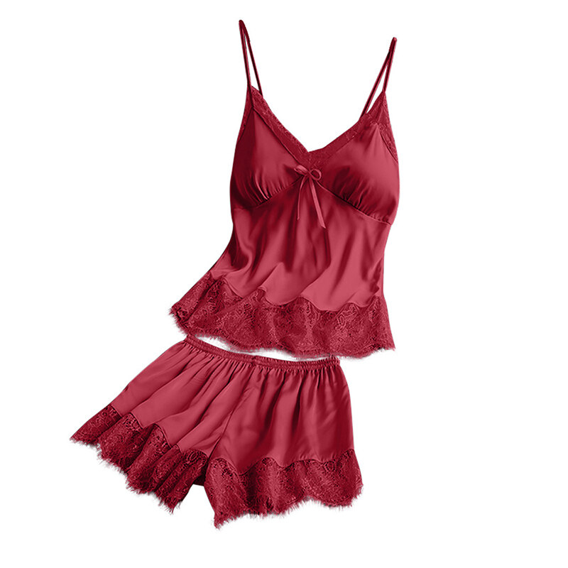 Features:Women Pajamas Set Solid Color Sleepwear Lace Camisole High Waist Short Two-piece Set Silk Home WearNotice:For manual measurement, please allow 1-3cm error Size:S-3XLColor:black,blue,pink,gray,green,redMaterial:satin + eyelash lacePackage Includes:a pcs Pajamas SetCare instructions: Hand washing is recommendedSize: please allow 1-2cm differs due to manual measurement, thanks.Note: Due to the difference between different monitors, the picture may not reflect the actual color of the item. We guarantee the style is the same as shown in the pictures, but not the same performance on different bodies as on the model. Thank you!