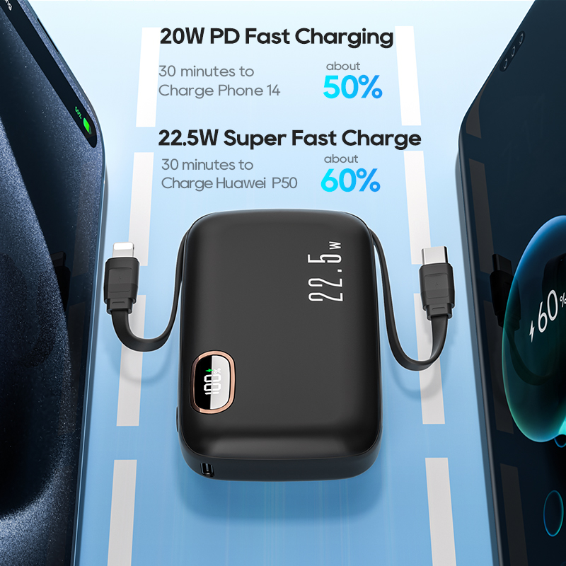 KUULAA 10000mAh Power Bank Mini PowerBank Portable Charger PD Fast Charging Built in Two Cables Type C L Compatible for iPhone 15 14 13 12 Huawei Xiaomi Samsung
